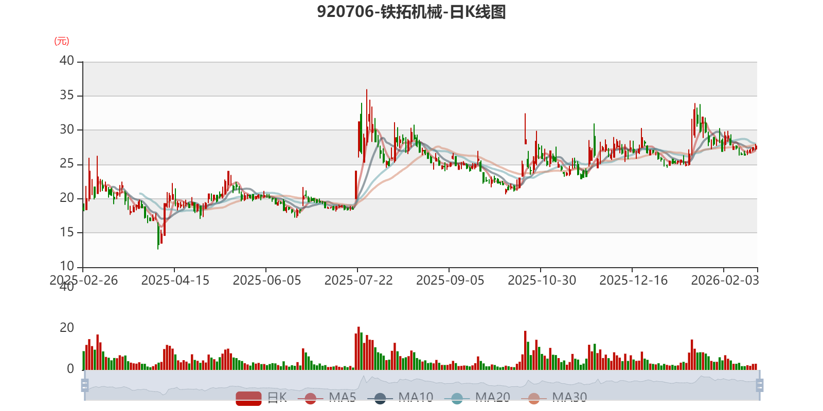 中证智能财讯铁拓机械(920706)2月26日晚间披露2025年业绩快报,公司实现营业收入3.75亿元,同比下降17.61%;归母净利润4924.14万元,同比下降3.77%;扣非净利润4221.59万元,同比下降10.59%;基本每股收益0.53元,加权平均净资产收益率为8.56%。以2月26日收盘价计算,铁拓机械目前市盈率(TTM)约为51.92倍,市净率(LF)约4.37倍,市销率(TTM)约6.28倍。